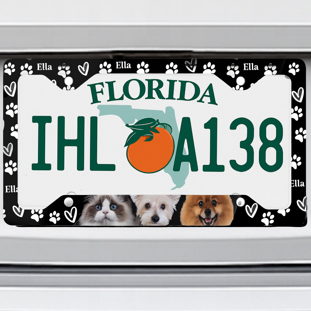 Custom Pet License Plate Frame - Personalized Dog & Cat Photo, Paw Print Design, Aluminum Pet Portrait Car Accessory