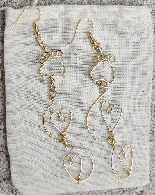 Gold Paw Print and Heart Shaped Long Drop Pet Lover Earrings