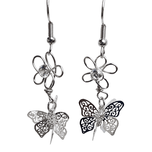 Silver Flower& Dancing Butterfly Crystal Drop Earring Jewelry
